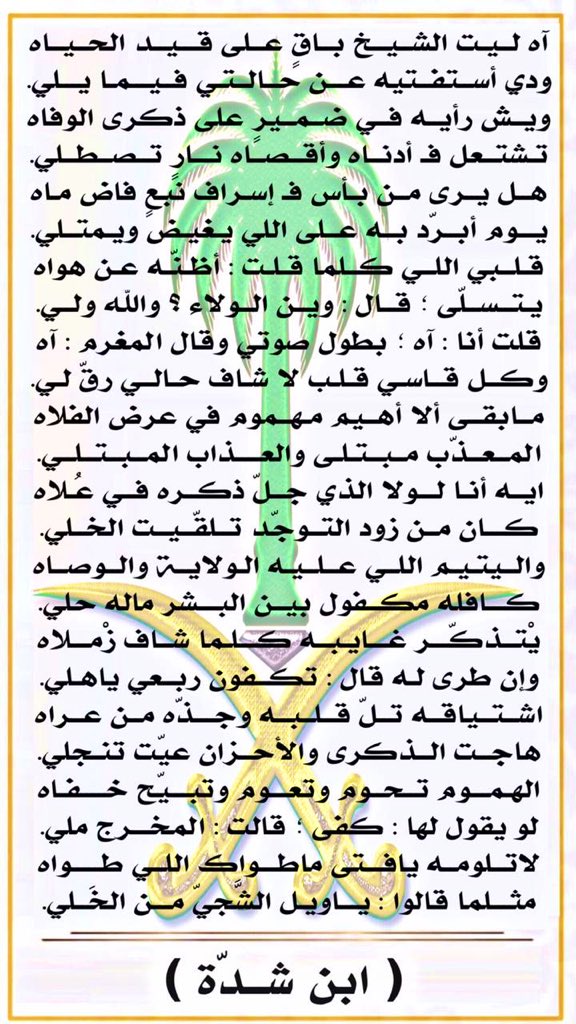 وعن خافقٍ في نار هجرك كويته=متلولسن بشراك حبك ولا زال الصبر عنك اسبوع انا ما قويته=شف ويش ظنك فيه يوم الجفا طال لا اتضيعه ما بين عله وليته=حفيت اسبوته بين الاقفا والاقبال اصبر واتفرج ما تغطي نسيته=اتكذب افعالك تناميق الاقوال |