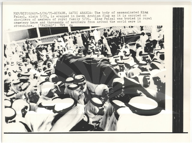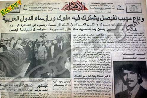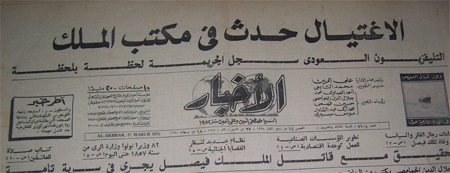 ![]() واللافت أن هذا الأمير الموتور قضى في الولايات المتحدة حياة لهو، تعاطى خلالها المخدرات، بل وتورط في قضية اتجار بحبوب الهلوسة الشهيرة "إل سي دي" في ولاية كلورادو عام 1970، وعاد بعدها إلى بلاده حيث احتجزت وثائقه ومنع من السفر، تجنبا لمزيد من الفضائح. ![]() وما يبعث على الدهشة أن وزير البترول السعودي الشهير كشف أن الإرهابي الدولي كارلوس حين احتجزه وعدد من نظرائه في فيينا بعد عدة أشهر من عملية الاغتيال، اعترف له أنه على معرفة بالأمير القاتل ![]() وأنه ذات مرة مازح صديقته متسائلا: "كيف يمكنها أن ترتبط بمثل هذا الرجعي؟" وأجابته: "هو قطعا ليس رجعيا، وقريبا ستتأكدون من أنه بطل حقيقي". ![]() ورحل الملك فيصل عن الدنيا بطريقة مأساوية، لكنه دخل التاريخ من أوسع أبوابه، وفعل ما لم يتجرأ آخرون على فعله قبله وبعده: شهر في أصعب الأوقات سلاح النفط الذي كان يباع حينها بدولارين ![]() وحاول انتهاج سياسة مستقلة نسبيا عن الولايات المتحدة، وسعى جاهدا إلى إدخال إصلاحات في نظام بلاده، وانحاز إلى تعليم المرأة وإلى الكثير من المظاهر الحضارية التي كانت تجد مقاومة شديدة داخل المجتمع السعودي مثل البث المرئي. ![]() كل ذلك يمنحه مكانة خاصة في تاريخ السعودية والمنطقة، مكانة يزيدها الزمن قيمة، إذ بمقتله انفتحت أنابيب النفط بكامل قوة ضخها، وعاد النفط سلعة تجارية عادية تهوي أسعارها وترتفع بحسب مصالح الشركات الاحتكارية الكبرى، وعلى هوى مزاج واشنطن السياسي. ![]() صدر أول تعبير عن الرواية الرسمية لهذا الحدث عبر بيان بثته إذاعة الرياض فى تمام الثانية عشرة من ظهر الخامس والعشرين من مارس وهو يقول :"بينما كان جلالة الملك فيصل المعظم يقوم بأعماله الرسمية هذا الصباح" ![]() "نهض من مجلسه الأمير فيصل بن مساعد بن عبد العزيز، إبن أخ جلالته متظاهراً بالسلام عليه، وعندما اقترب منه، أطلق الرصاص على جلالته عدة مرات فأصابه بجراح". ![]() ثم تابع البيان: "ومما تجدر الإشارة إليه أن المذكور مختل الشعور، وقام بما قام به منفرداً وليس لأحد علاقة بما أقدم عليه. وقد نقل جلالة الملك فيصل حفظه الله إلى مستشفى الرياض المركزي، والعلاج مستمر لجلالته. منّ الله على جلالته بلباس الصحة والعافية، وطمأن شعبه الوفى ليراه قريباً بصحة وسلام". ![]() ثم جاء البيان الثانى فى تمام الواحدة وعشر دقائق بعد الظهر، حين قطعت إذاعة الرياض إرسالها لتذيع بياناً صادراً عن الديوان الملكى يقول : "ببالغ الأسى والحزن، ينعى الديوان الملكي، باسم صاحب السمو ولى العهد، وكافة أفراد الأسرة، ونيابة عن الأمة، حضرة صاحب الجلالة الملك فيصل المعظم، حيث وافاه الأجل المحتوم متأثراً بجراحه، إثر الاعتداء الأثيم الذى قام به الأمير فيصل بن مساعد بن عبد العزيز المعروف باختلاله العقلي، على جلالته". ![]() وتابع البيان: "فإنّا لله وإنّا إليه راجعون.. تغمّد الله جلالته بواسع رحمته وغفرانه، وأسكنه فسيح جناته، وخلفه فى هذه الأمة بتمسكها بعرى دينها القويم، وحفظها به، وجزاه الله عن الإسلام وهذه الأمة وأمة الإسلام عامة خير جزاء". ![]() بعد أربعين دقيقة، وفى تمام الثانية إلا عشر دقائق صدر عن الديوان الملكى البيان التالى : "تقرر إقامة الصلاة على حضرة صاحب الجلالة الملك فيصل المعظم غداً الأربعاء، بعد إقامة صلاة العصر مباشرة فى جامع الرياض الكبير. تغمده الله برحمته، وأسكنه فسيح جناته. إنه سميع مجيب، وإنّا لله وإنّا إليه راجعون". ![]() وبعد ذلك بنصف ساعة وفى تمام الساعة الثانية والثلث صدر البيان الرابع والأخير عن الديوان الملكى ليقول : "قام أفراد الأسرة وفى مقدمتهم: أولاً/ صاحب السمو الملكى الأمير عبد الله بن عبد الرحمن. ثانياً/ الأمير محمد بن عبد العزيز. ثالثاً/ الأمير ناصر بن عبد العزيز. رابعا/ الأمير سعد بن عبد العزيز. خامساً/ الأمير فهد بن عبد العزيز. "قاموا بمبايعة ولى العهد الأمير خالد بن عبد العزيز ملكاً على البلاد". ![]() ثم تابع بيان الديوان الملكى قائلاً:"وبعد إتمام البيعة أعلن صاحب الجلالة الملك خالد بن ع